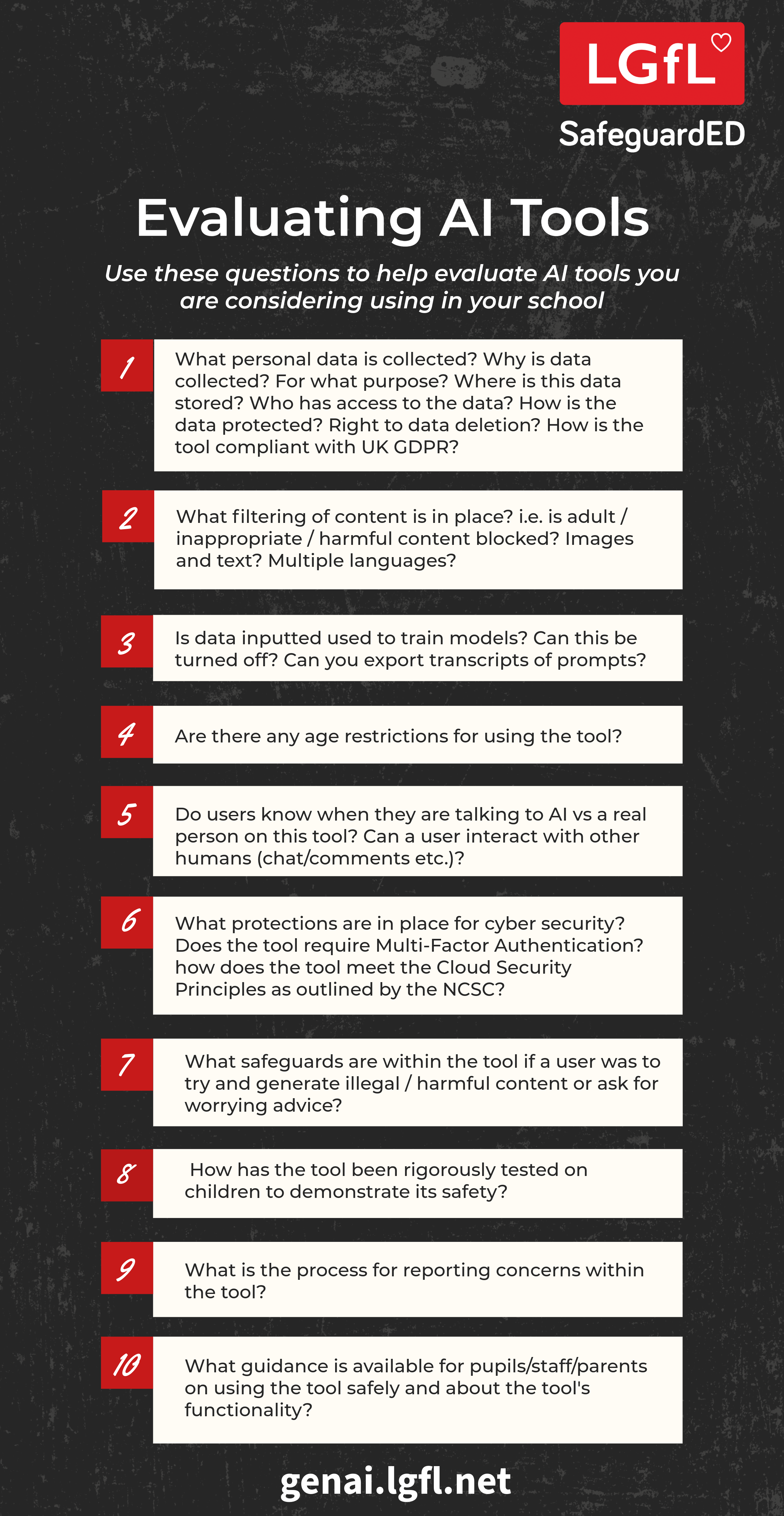 While AI can help transform education when implemented safely, the DfE’s recent product safety standards highlight that most current AI tools are non-compliant or fit for purpose when used directly with children. However, children are still likely to access AI when they are not at school. It is recommended to focus your efforts on upskilling them to understand what AI is, how best to use it, along with any ethical and safety considerations that are associated with AI.